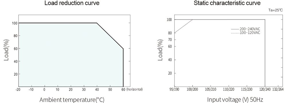 | 笔记 | 1. 除另有说明外,所有参数均在 230VAC 输入电压、额定负载和 25°C 条件下测量。 2、纹波和噪声电压是在20MHz带宽示波器上测量的,12英寸双绞线端,电容为0.1μ和47μ。 3、精度:电压设定误差、线性调整率、负载调整率。 4、线性调整率测量方法:在额定负载下,从低电压到高电压测试。 5、负载调整率测量方法:0%~100%额定负载。 6. 当工作海拔高于 2000 m(6500ft)时,按 5°C/1000 m 调整工作环境。 7、电源应视为系统中部件的一部分,应与终端设备一起确认电磁兼容性。 | |||||