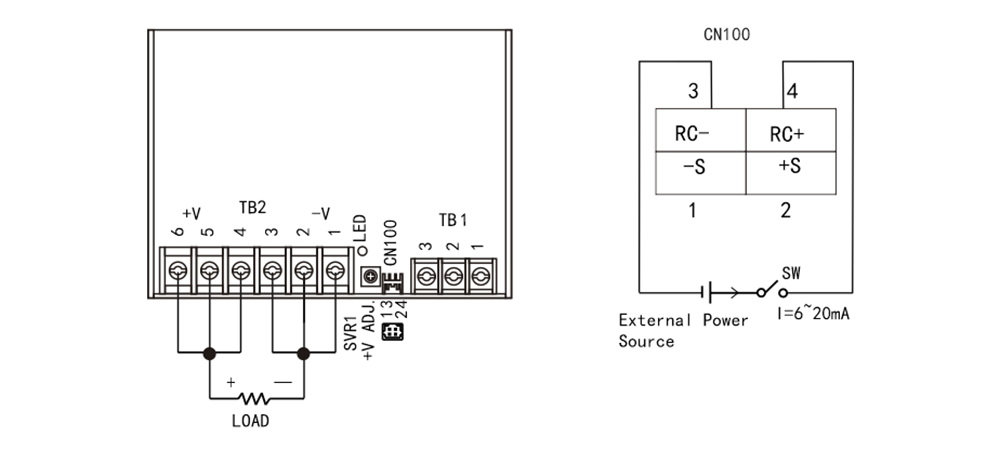 | 1 | -S | 感性信号-,-S连接到负载负端。 +S、-S应绞合以尽量减少噪音的影响。最大线路压降可补偿至0.3V。 |